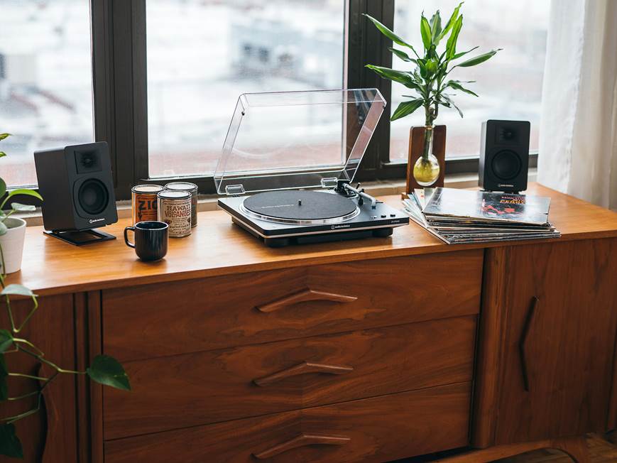 This fully automatic belt-drive turntable provides high-fidelity audio reproduction for vinyl enthusiasts seeking modern convenience. The J-shaped tonearm and integrated AT-VM95C cartridge work in tandem to deliver precise tracking and exceptional clarity. Built-in Bluetooth with aptX Adaptive technology allows for seamless wireless streaming to your favorite speakers or headphones. An internal switchable phono preamp offers the flexibility to connect to any audio system via line-level or phono inputs. The anti-resonance die-cast aluminum platter ensures stable rotation and reduced vibration for a superior listening experience.